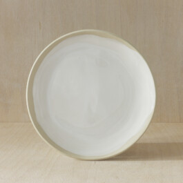 Dünner Teller mit glänzender, weißer Glasur auf der Oberseite und unglasiert am Rand und auf der Unterseite.